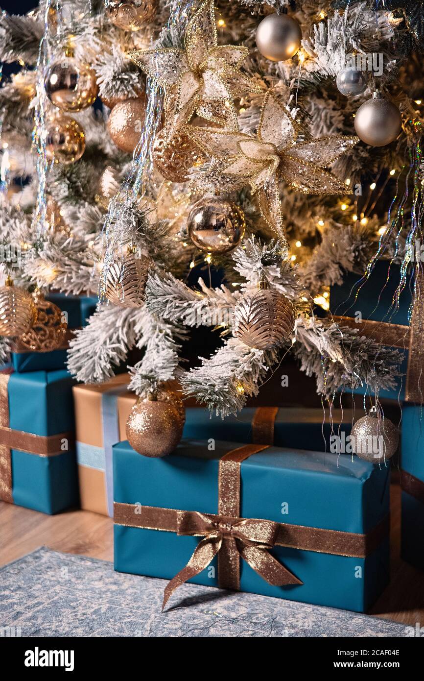Gifts Under Christmas Tree Box With Gifts Is Packed In Blue Paper Tied With Gold Ribbon Tree Is Decorated With Christmas Toys Stock Photo Alamy